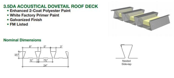 Dovetail decking is a structural metal decking that's capable of long spans. The main advantage of the dovetail profile is that the underside of the panel looks like a finished looking ceiling. In addition, you can attach lighting, HVAC, plumbing, or electrical to the underside of the dovetail panels.